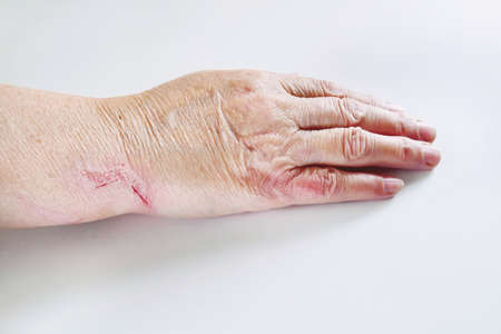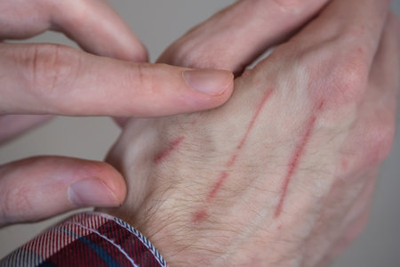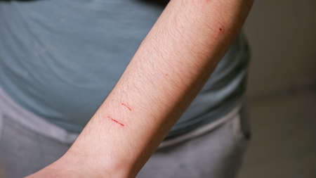 Close up - man showing hand with cat scratches on skin. Pain, damaged, inflammation, injury concept