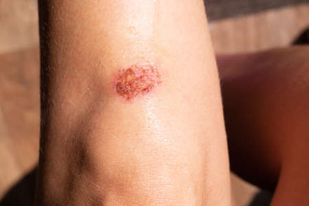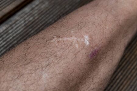 A Closeup Shot Of The Keloid Scar On A Male Arm. Selective Focus On Subject