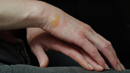 Close-up of a woman's hand with a blister from a boiled water burn, damaged skin, 1st or second degree burn. Painful wound. thermal burn. Water bladder from a burn, wound treatment.Macro photo.
