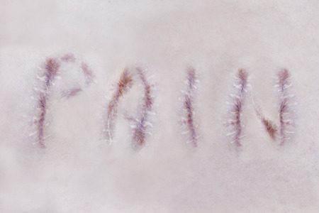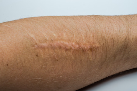 Young womans arm shoing scars from self mutilation, on plain background self harm. room for text.
