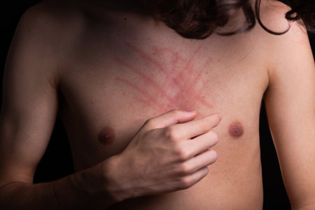 Chest of an angry man. Hand itching. Skin disease. Irritation, allergy. Isolated on black background.