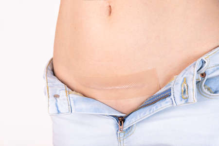 Woman is applying patch with a silicone sheeting on her scar after C-section surgery. Therapy for five months.