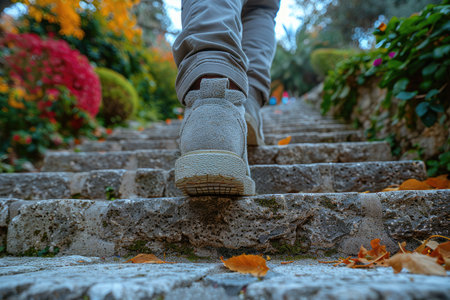 A person is walking up a set of stairs in their white shoes. Concept of determination and focus as the person climbs the steps