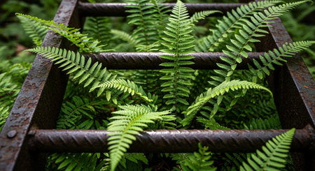 Bridge and wooden walkway surrounded by green vegetation in the Retiro Park of Madrid, in Spain. Europe. Vertical photography.