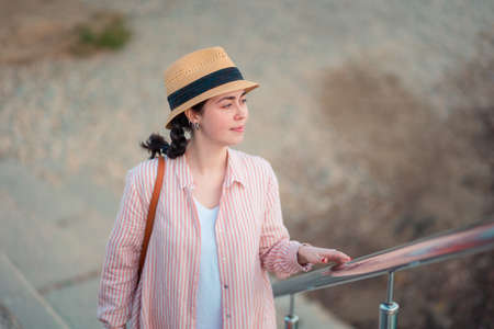 Portrait of pretty young woman in a straw hat climbs the steps and looks away. top view.