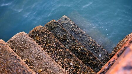 Concrete stairway old fishing port's with barnacle reef and sea water background.