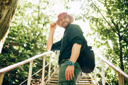 Smiling traveler in red hat, wearing backpack climbing up on wooden passage in national nature park in Germany, bottom view of happy cheerful tourist over green forest background.