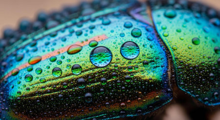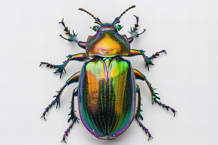 Stunning iridescent beetle with vibrant colors and intricate patterns against a lavender backdrop, a captivating glimpse into natures beauty and detail