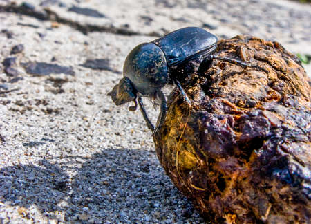 Dung beetle on a road in the macro