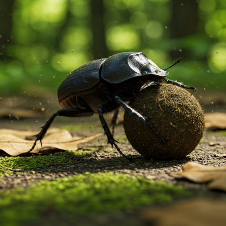 dung beetle rolling ball on a leafy forest floor, created with generative ai