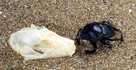 Sacred scarab beetle Scarabaeus and skull of giant bat on sand.