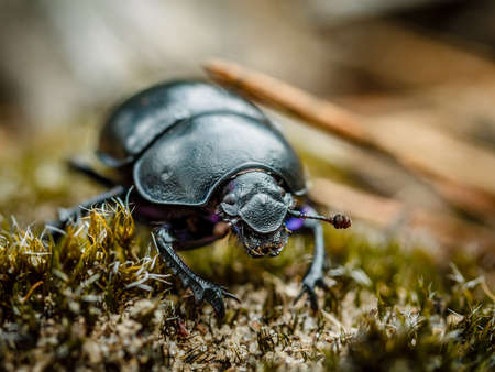 Macro shot of forest dung beetle (Anoplotrupes stercorosus) on moss