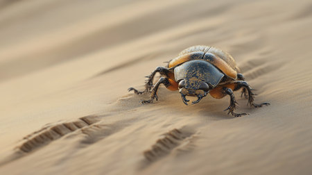 A close-up of a desert beetle navigating the shifting sands, leaving small tracks in its wake.
