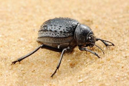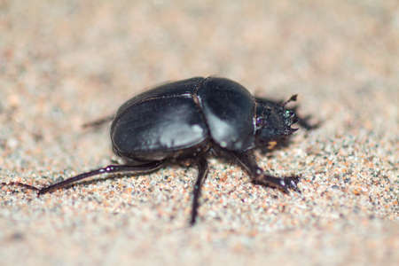 A thick round black beetle in the sand. Close up of a small beetle.