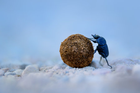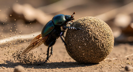 A macro shot captures a dung beetle actively rolling a large ball of earth or dung across sandy ground. The image highlights the insect's strength, determination, and its role in the ecosystem.