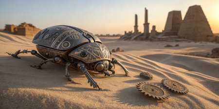 A mechanical beetle crawls through golden sand near ancient stone ruins, illuminated by the warm glow of a setting sun. Gears rest nearby, hinting at forgotten technology.
