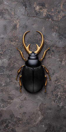 Black and gold beetle on dark stone background