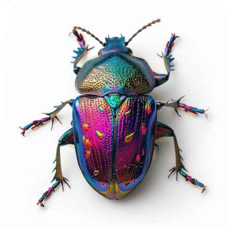 the beetle, showcased against a pristine white background, stands out with its intricate features and vibrant colors, creating a striking contrast that exudes simplicity and elegance, perfect for nature enthusiasts and entomology fans fascinated by insect photography and macro wildlife images. ai generated