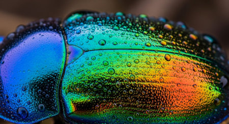 Macro photography captures the stunning metallic sheen and detailed surface patterns of a jewel beetle's exoskeleton, displaying a spectrum of blues, greens, and purples