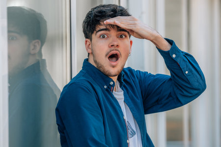 Surprised young male. Shocking news. Astonished man emotion, handsome guy portrait, facial expression concept