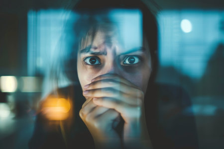 A person expresses intense fear, covering their face with hands, revealing deep emotional struggle