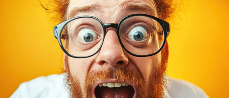 A man with wild hair and glasses expresses shock in front of a vivid yellow backdrop his eyes wide and mouth open.