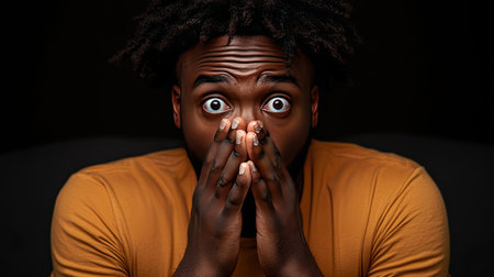 Close-up of a man with hands on his face, eyes wide in shock and fear, capturing an intense emotional reaction.