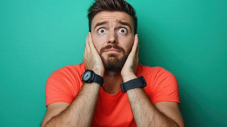 Man Surprised Shocked Hands On Cheeks Reaction Portrait Black Backdrop. Astonished Look