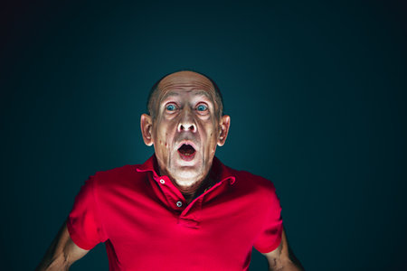 Dumbfounded. Portrait of crazy scared and shocked caucasian man isolated on dark background. Copyspace for ad. Bright facial expression, human emotions concept. Watching horror on TV, cinema.