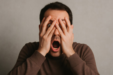 Portrait of a shocked man covering his eyes with his hands and screaming with his mouth wide open, expressing fear and surprise
