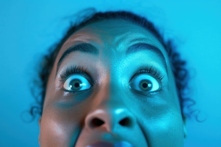 A striking close-up of a person's surprised face with wide eyes set against a beautifully blurred background, capturing raw emotion and an artistic perspective.