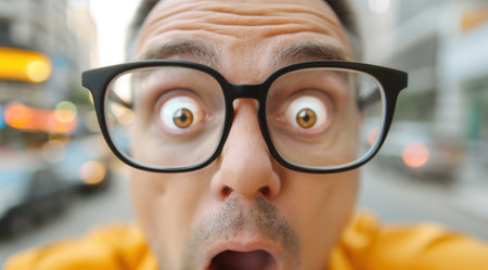 A man with glasses displays a huge smile and wide eyes showcasing excitement and joy in a warm indoor setting conveying a playful mood.