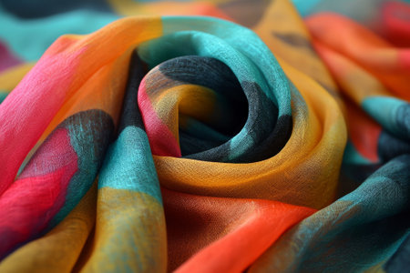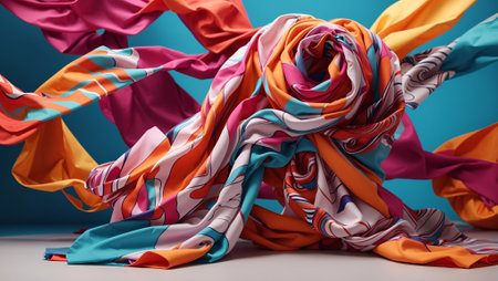 A vibrant and colorful silk scarf elegantly draped on a rustic wooden surface, creating intriguing shadows in soft natural light, perfect for fashion enthusiasts.