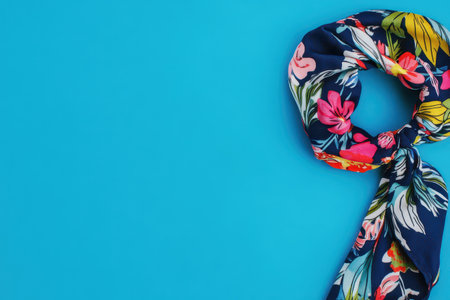 A colorful floral scarf is neatly arranged on a vibrant blue surface. The unique pattern adds a touch of elegance and style to the setting.