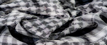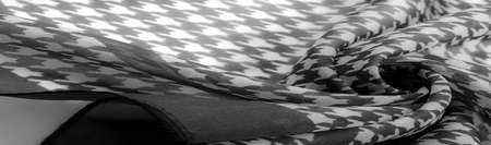 Silk fabric. Black and white squares with floral print. The flowers are black and white. Texture background pattern. From the floral print, the fabric breathes in spring and good mood.