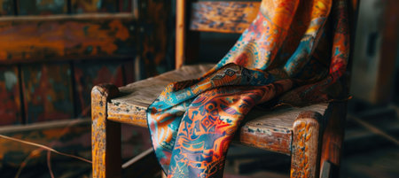 Close-up of a colorful silk scarf with intricate patterns elegantly draped over a rustic wooden chair. soft daylight enhances the vibrant hues, creating a warm, artistic atmosphere perfect for design inspiration in textile and home decor.