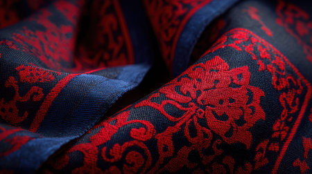 This stunning textile features a rich navy background adorned with vibrant red floral patterns, perfect for adding a touch of elegance to various projects or home decor.