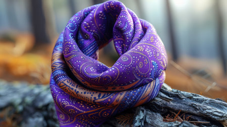 A close-up of a purple and gold paisley patterned scarf on a tree branch.