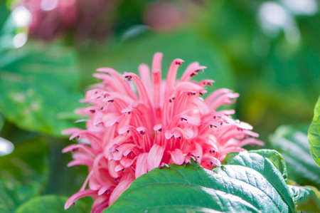 Beautiful shaggy pink flowers against soft blurred green foliage background