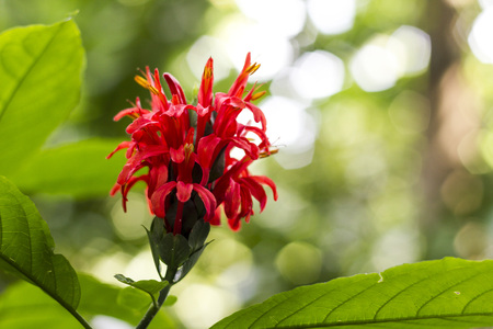 A single red flower of monarda didyma (bergamot, rhododendron, bee balm, horsemint, oswego tea, crimson beebalm, scarlet beebalm, scarlet monarda) in the summer garden. Medicinal plant