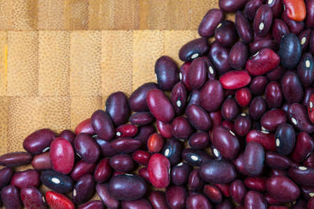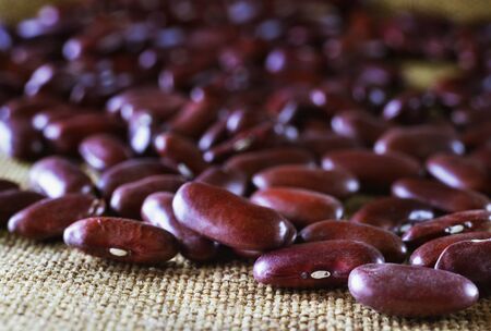 macro Close-up of Organic Rajma, (Laal Lobia ) or red kidney beans dal cleaned on Jute mat and wooden top.