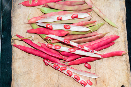 purple beans and pods on a wooden surface, vegetables, food, macro
