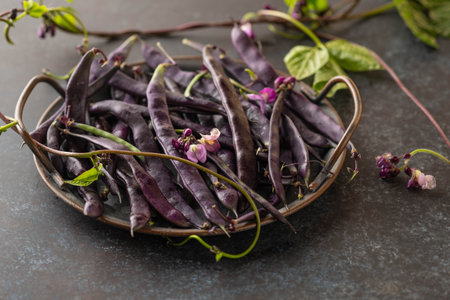 fresh purple string beans on a black wooden table, clean eating,selective focus