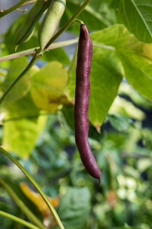 Runner beans Phaseolus coccineus plant with ripe purple colored pods and green foliage