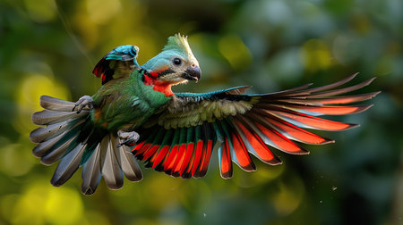 colorful bird flying over lush green forest, created with generative ai