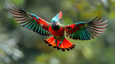 A vibrant parrot soars through the sky, its plumage a kaleidoscope of azure, emerald, and crimson. Its wings beat rhythmically, carrying it effortlessly through the air. The parrot's piercing gaze surveys the world below, its beak slightly agape as it calls out.