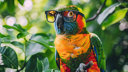 A vibrant parrot with rainbow feathers and stylish glasses sits gracefully on a tree branch.
