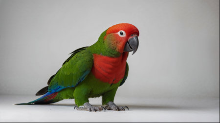 A green and red parrot is standing on a white background. The bird is looking at the camera with a curious expression