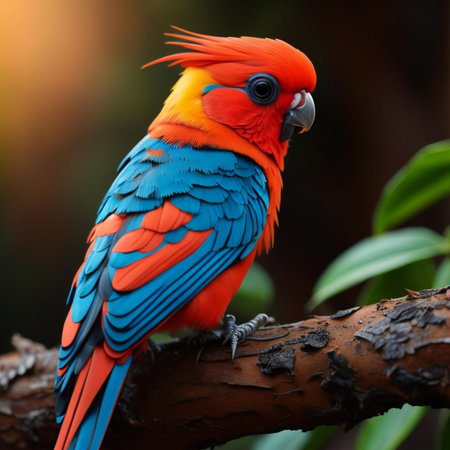 An AI generated illustration of a vibrant colorful parrot perching atop a branch