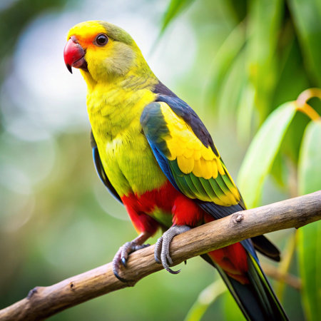 A stunning parrot showcases bright, colorful feathers, posing gracefully against a softly blurred background, radiating serenity and charm in nature's gentle embrace.